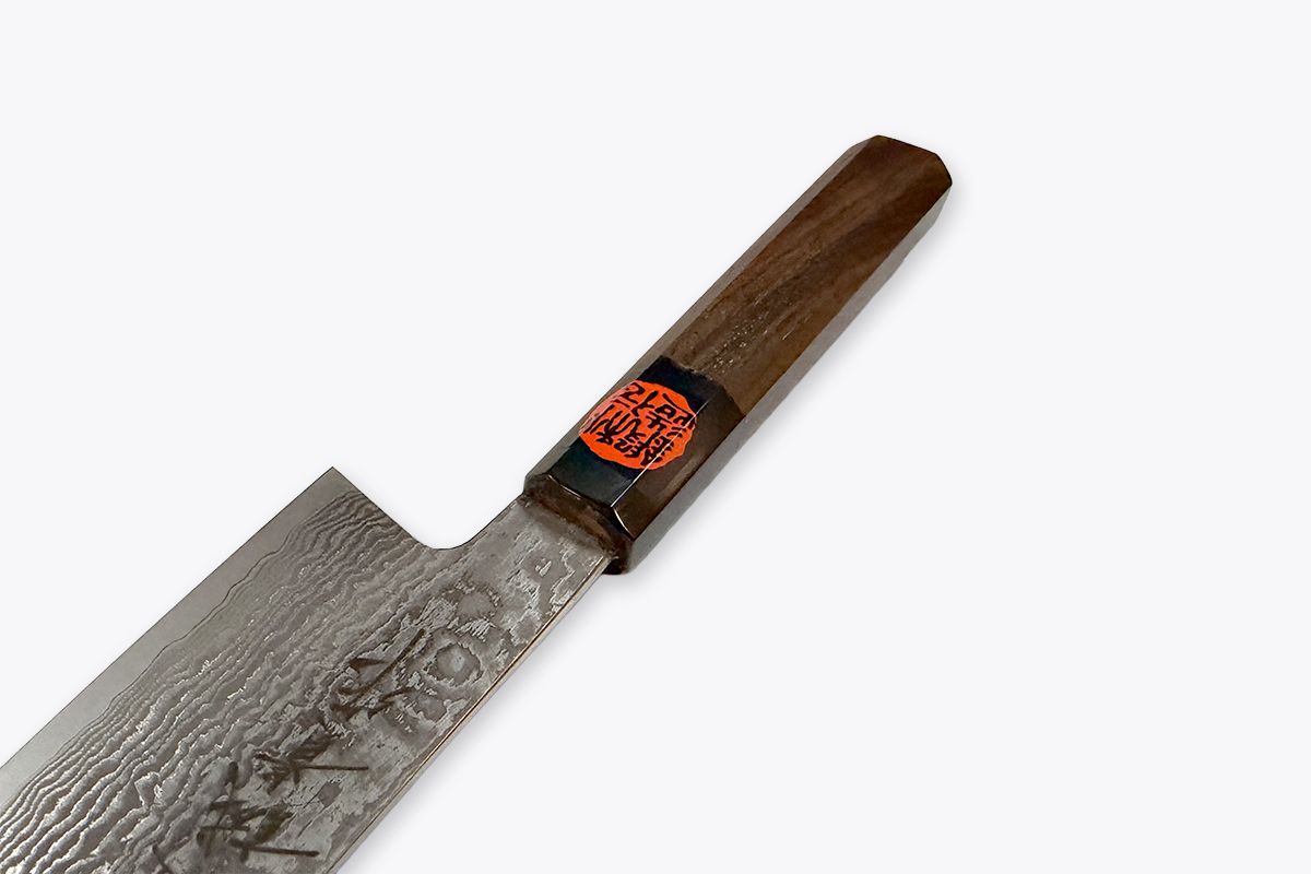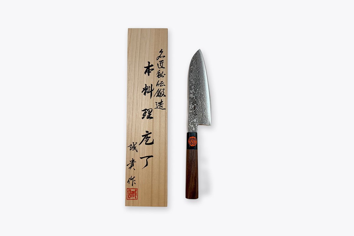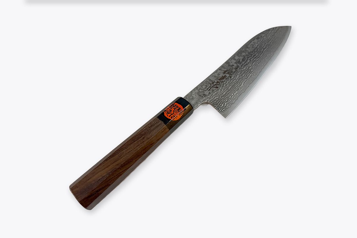 This is the best Santoku we have at the moment. Shigeki Tanaka is the 4th generation knife blacksmith in Miki city. He combines his traditional blacksmiths skills with modern high end stainless steel. The result is a beautiful knife with tough long lasting edge.