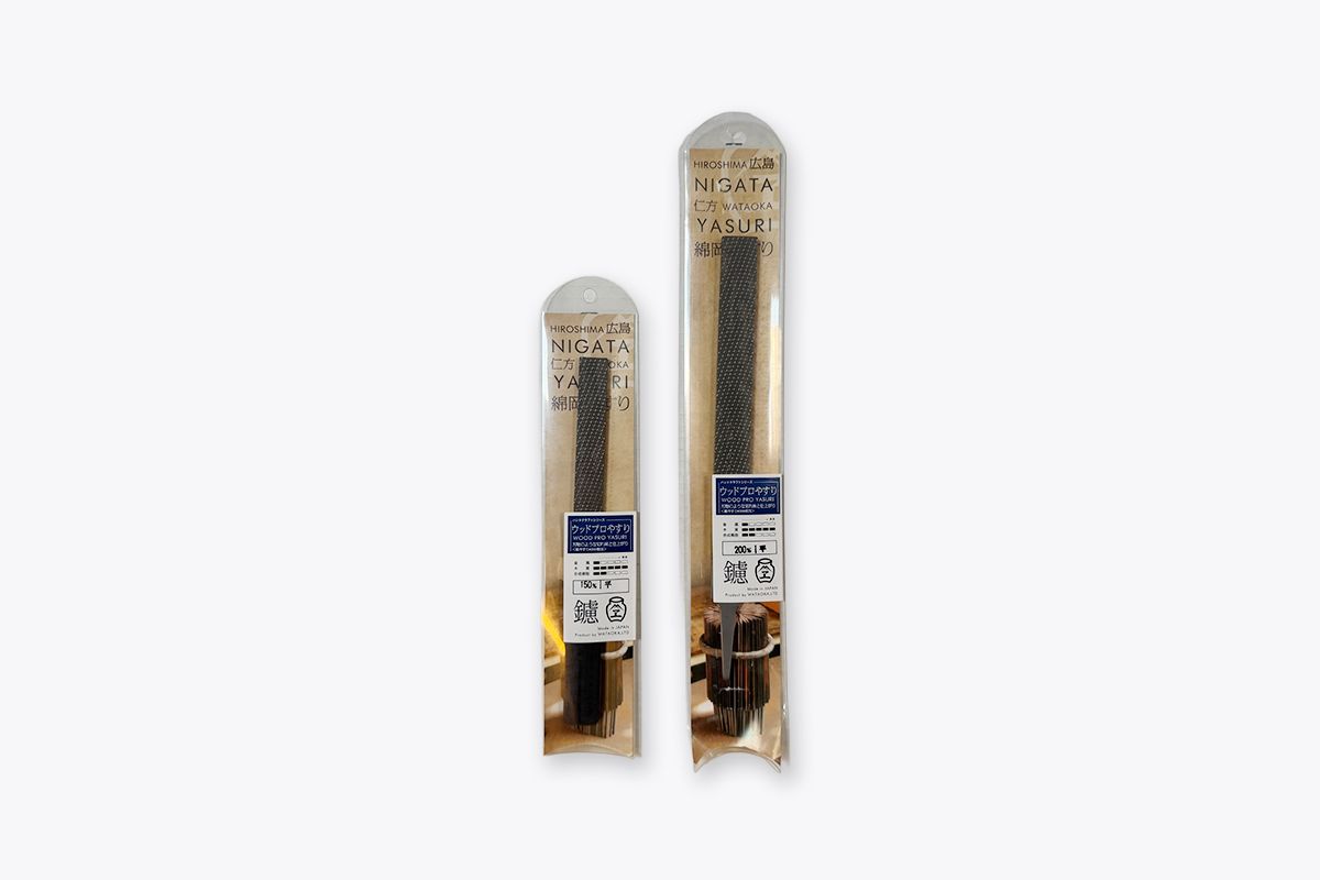 High quality wood files by Wataoka. It is made with S15C steel, heat treated for strength and durability. It can be used on wood, plywood, bamboo, aluminum, plastic, and plasters. It has file edge on both sides.
