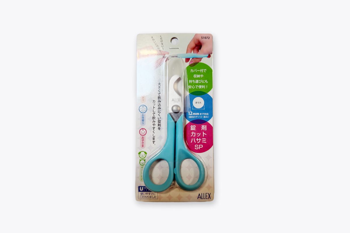 Speciality scissors to cut pills up to 12mm in diameter without crushing it. Please place your left hand under the scissors while cutting to make sure the pill doesn't fall off.